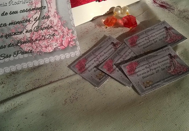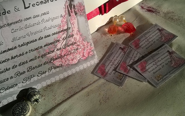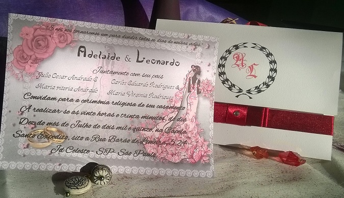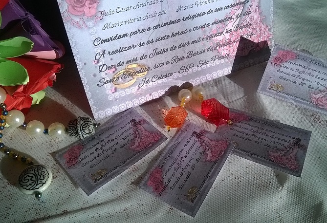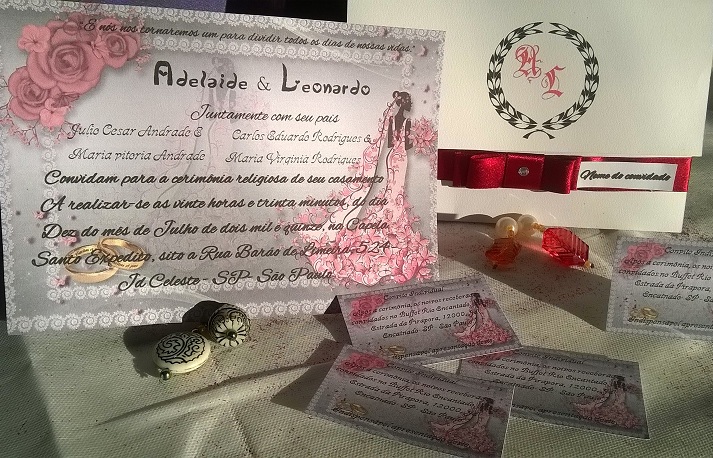 Convites e envelopes elaborados manualmente um a um (em vários tipos de papel, entre e contato para mudar caso queira, trabalhamos com vários tipos e gramaturas ), completos com impressão jato de tinta de alta qualidade, entregues ao cliente embalados individualmente em plástico transparente e acomodados em uma linda caixa, venda em quantidade mínima de 100 unidades do mesmo produto, e entregues pelos correios pelo serviço de SEDEX, onde o frete será por conta do consumidor, que deverá calcula-lo ao finalizar a compra do produto disponível no site.