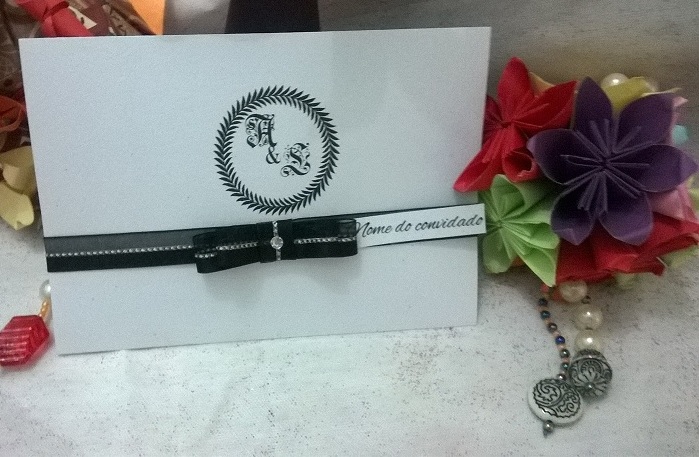 Convite tamanho 20x14 cm, e envelope tamanho 21x14,5 cm, confeccionado em papel VERGÊ gramatura 180, decorado com laço Chanel em cetim. O nome do convidado ou família será impresso e colado junto ao laço e irá também junto 2 unidades de convite individual impresso no mesmo modelo do convite escolhido, no tamanho de 8x5 cm.